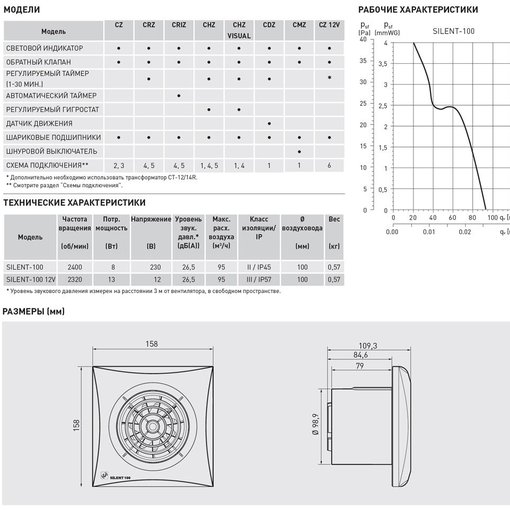 Встроенный обратный клапан предотвращает обратный поток воздуха. Корпус выполнен из высококачественного АБС-пластика, устойчивого к изменению цвета. Максимальный расход воздуха составляет 95 м³/ч, диаметр воздуховода – 100 мм. Вентилятор имеет II класс электробезопасности (не требует заземления), класс защиты IP45 и рабочий температурный диапазон от 0°С до +40°С.