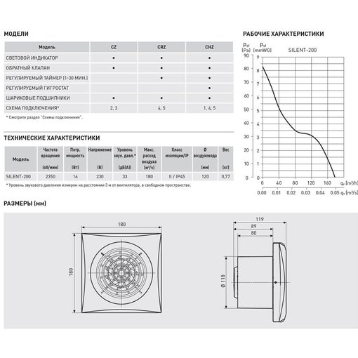 Максимальный расход воздуха составляет 180 м3/ч. Вентиляторы предназначены для присоединения к воздуховодам диаметром 120 мм.